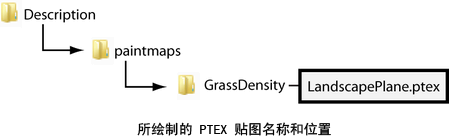 当您在 Maya 中创建 Ptex 贴图时,您指定的“贴图名称”(Map Name)被分配到包含 Ptex 文件的文件夹名称。Ptex 文件名派生于您对其进行绘制的多边形网格对象。Maya 将 Ptex 文件夹和文件存储在 paintmaps 文件夹中(该文件夹存储在 Description 目录中)。例如,如果您在命名为 LandscapePlane 的多边形网格上绘制一个命名为 GrassDensity 的贴图,文件夹和文件的结构如下所示: