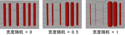 该设置仅用于“宽度随机”(Width Rand)大于 0 时。它定义随机宽度的分布方式。如果“宽度偏移”(Width Bias)为 0,则宽管的数量将与窄管的相等。如果“宽度偏移”(Width Bias)为正值,则创建的宽管将多于窄管。如果“宽度偏移”(Width Bias)为负值,则创建的窄管将多于宽管。如果正在创建植物,负值将产生最逼真的效果。(每个较大植物通常都包含多个较小植物。)