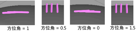 同仰角一样,设想正站在绘制路径上,沿路径方向指向正前方。向左和向右旋转身体,就像更改手臂的方位角一样。这些属性定义管绕法线轴旋转的可能的角度的范围。如果这两个值都是 0,则管指向路径方向。如果“最小仰角”(Elevation Min)和“最大仰角”(Elevation Max)都是 1,则“方位角”(Azimuth)值不起作用。