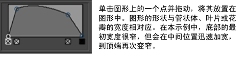 这些设置允许您使用图表控制从根部到管尖端的宽度,而不是在这两个值之间使用简单线性插值。当与“网格笔刷类型”(Mesh Brush Type)组合使用时,您可以定义类似球体的形状,还可以控制管的轮廓。“宽度比例”(Width Scale)作为与当前宽度的比例而应用,默认值为 1.0,因此以前的预设对它起作用。