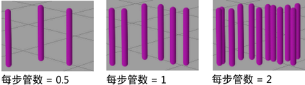 定义在绘制的每个路径的第一个点处种植的管数。如果将“每步管数”(Tubes Per Step)设定为 0,则您可以使用该设置沿路径创建单个对象。例如,将“每步管数”(Tubes Per Step)设定为 1,为每个笔划仅形成一棵树的树干,或将其设定为 100,创建日出或聚光灯辉光效果。