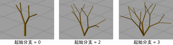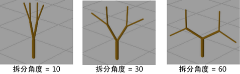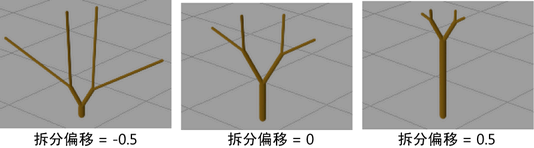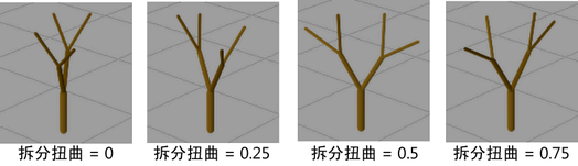 定义拆分时分支相对于其根部的扭曲度。如果该值为正值,则沿逆时针扭曲,如果该值为负值,则沿顺时针扭曲。如果“拆分扭曲”(Split Twist)为 1,则分支扭曲 360 度。