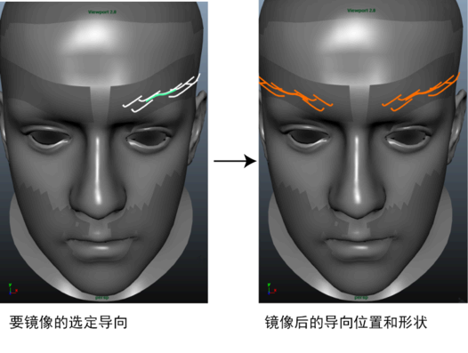 可以使用“镜像导向”(Mirror Guide)工具,沿多边形网格的 X 轴镜像导向位置和形状。使用此方法可以生成两个对称的基本体区域,如眉毛和中分发型。