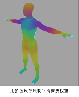 仅适用于“绘制蒙皮权重工具”(Paint Skin Weights Tool)。启用该设置后,可以将绑定的几何体上所绘制蒙皮权重的分布视作多色反馈。显示在绑定几何体上的颜色与骨架的关节和骨骼有关,并且这些颜色指示每个关节影响的蒙皮区域。在“顶点”(Vertex)模式下或使用“绘制蒙皮权重工具”(Paint Skin Weights Tool)时,可以在场景视图中查看“多色反馈”(Multi-color Feedback)。