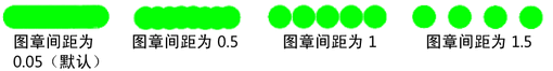 在曲面上单击笔刷可创建图章。笔刷笔划由多个重叠的图章构成。可以设定图章的重叠方式。如果将“图章间距”(Stamp Spacing)设定为 1,则每个图章的边将相互接触。如果将间距设定为大于 1,则图章间将存在间距。如果将间距设定为小于 1,则图章将重叠。