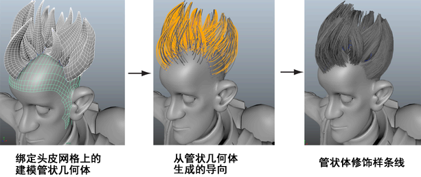 使用管状多边形网格定义默认样条线头发修饰的形状。XGen 会从已建模的管状体对象的形状生成导向。