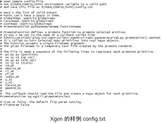 默认情况下,XGen 使用 XGEN_CONFIG_PATH 环境变量配置文件位置。它必须指向一个包含 config.txt 特性文件的目录。下图是一个 config.txt 示例: