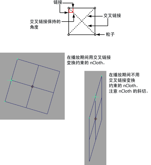 nCloth 由通过许多链接连接的众多粒子的网络构成,它们一起创建动力学网格。在该网络中,还有用于进一步连接这些粒子的交叉链接。链接可保持粒子之间的距离,交叉链接可保持链接之间的角度,从而使 nCloth 保持稳定并防止斜切之类的布料行为。