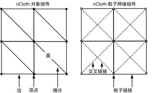 nCloth 的粒子网络中的组件直接对应于其对象组件。nCloth 中的每个顶点都有一个粒子,每条边都有一个链接,每个面都有两个交叉链接:一个位于四边形分割(细分)处,另一个的位置与四边形分割垂直。