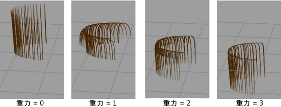 在生长周期中的每个步骤,可以对管应用力。这些小的累积更改会以一种更系统的方式影响整个管的形状,从而产生不同种类的效果。可以应用螺旋力、重力、风、湍流以及阻止管穿过地面的排斥力。由于生长具有累积性,因此力往往会在管的尖端比在根部有更好的效果。