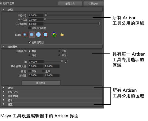 Artisan 使用Maya “工具设置”(Tool Settings)编辑器设置工具特性。所有 Artisan 工具共享公用选项(在 Artisan“工具设置”(Tool Settings)中对这些选项进行了描述)。