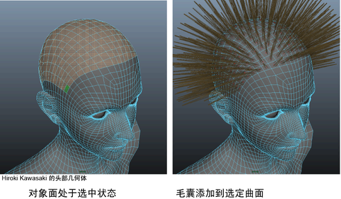 在多边形对象上创建 nHair 系统时,您可以选择根据该对象的 UV 集映射来放置毛囊,也可以将毛囊放置在选定的面上。