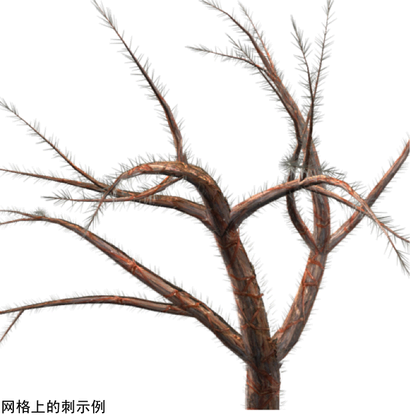 可以从使用“网格笔刷类型”(Mesh > Brush Type)时创建的三角形的曲面上生成大量刺。这些刺是使用与“细线”(ThinLine)“笔刷类型”(Brush Type)相关联的渲染方法绘制的,并快速地渲染。它们是单分段管,且不会显示在笔划的线框表示中。可以使用这些刺为植物添加刺和芒刺,或创建毛茸茸的或有绒毛的管。