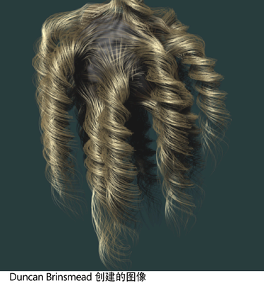 通过使用“卷曲”(Curl)置换加上较高的“卷曲频率”(Curl Frequency)和较大的“截面分段”(Curl Frequency)数,可创建出细卷。“截面分段”(Sub Segments)较高可能会减慢刷新,因此可能需要在执行操作时降低头发系统的“显示质量”(Display Quality)以加快播放。束中所有头发的卷曲相同。如果束较窄,而卷曲置换较大,则将创建出螺形。对于“爆炸”式卷发或部分烫卷的头发,可能需要头发较少的常规卷曲。“噪波”(Noise)置换与卷曲不同,束中的每一根头发都是单独的置换。尝试为“噪波”(Noise)键入超出滑块范围的值,例如 2 或 3。此外,如要查看高频率值的效果,则需要增加“截面分段”(Sub Segments)。