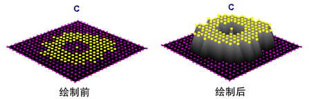 使用选定的 Artisan 工具绘制曲面。作出的任何笔刷笔划仅影响选定组件。未选定的组件被遮罩,不受绘制影响,如下例所示。