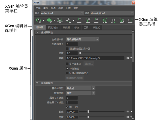 XGen 编辑器是创建和编辑 XGen 集合和描述的主区域。此编辑器提供用于创建、修改和控制基本体的选项,包括属性、预览和渲染设置、修饰笔刷、修改器等。通过从“建模”(Modeling)菜单集中选择“XGen 编辑器 > 生成”(XGen Editor > Generate),访问 XGen 编辑器。
