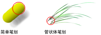 在显示“Paint Effects”画布时,将自动选择“Paint Effects 工具”(Paint Effects Tool)。光标将显示笔划路径的宽度。对于简单的笔划,笔刷宽度定义绘制图章。对于具有管状体的笔划,笔刷宽度定义笔划路径边界 — 管状体只能在笔刷宽度定义的路径内开始增长。