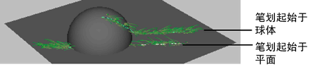 - 因为笔划将尝试保留在曲面上,所以可能会产生异常结果。例如,假设有一个与平面相交的球体。如果开始在球体上进行绘制,那么笔刷一旦离开球体,就会查找另一曲面以继续绘制,在本例中另一曲面即为平面。但是,如果开始在平面上绘制,那么笔刷就永远不会离开曲面,所以笔划不会在球体上继续绘制。