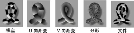 该选项仅当“贴图颜色”(Map Color)或“贴图不透明度”(Map Opacity)处于启用状态时使用。选择要映射到“颜色”(Color)和“不透明度”(Opacity)的纹理类型。您可以映射“棋盘格”(Checker)、“U 向渐变”(U Ramp)、“V 向渐变”(V Ramp)、“分形”(Fractal)和“文件”(File)类型纹理。有关映射文件类型纹理的详细信息,请参见将文件纹理映射到颜色和不透明度。