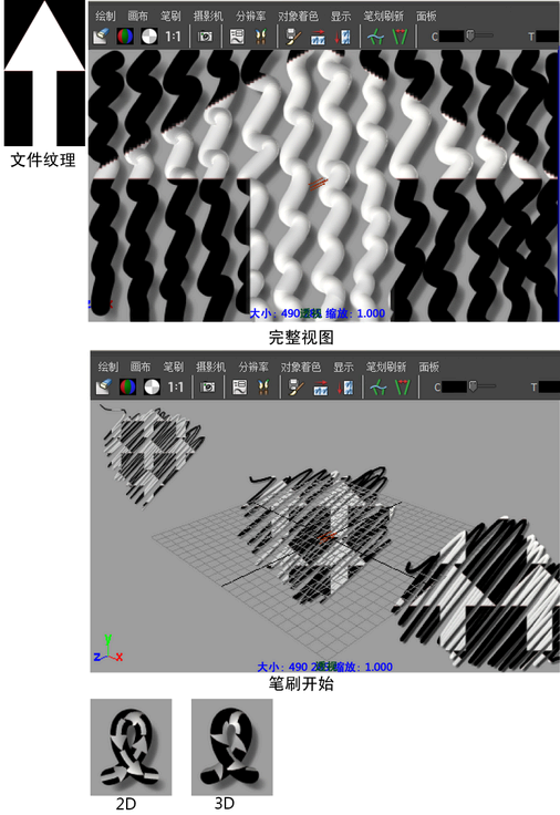 映射在“眼空间”内,类似于“完整视图”(Full View),但纹理的位置、比例和偏移基于笔刷笔划的开始位置。该纹理技术在对笔刷启用“在“深度”(Depth)模式下“绘制”(Paint)的场景中效果最佳。如果笔刷笔划从远处场景开始,则纹理较小。笔刷笔划的开始位置越近,纹理就越大。