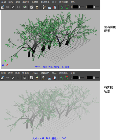 可以使用环境雾来模拟大气粒子的效果。如果在场景中使用“物理雾”(Physical Fog),则可将其显示在场景绘制视图中,以便查看“Paint Effects”笔划在已渲染雾环境中的样子。有关使用“物理雾”(Physical Fog)的信息,请参见大气。
