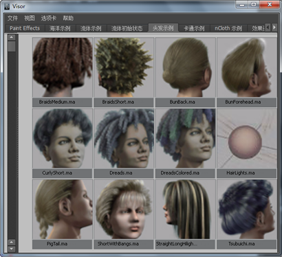 选择以从头发预设(假发)中选择,头发预设是可以导入和附加到曲面的已设置样式的头发系统。每个示例文件包括: