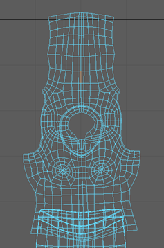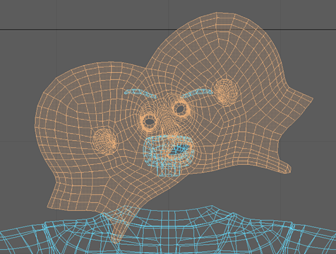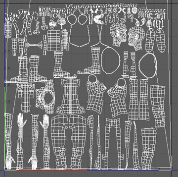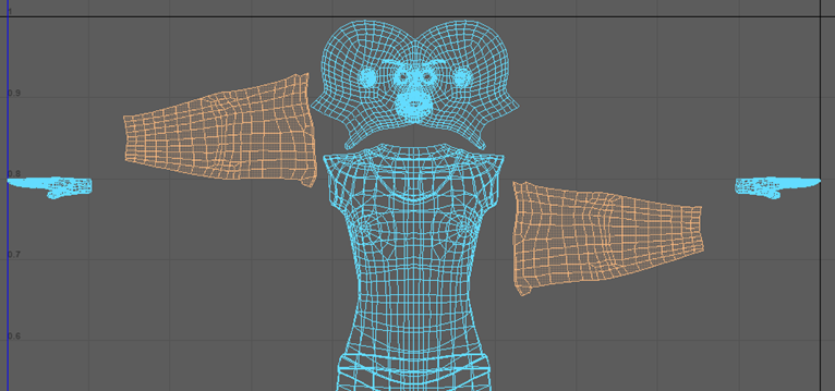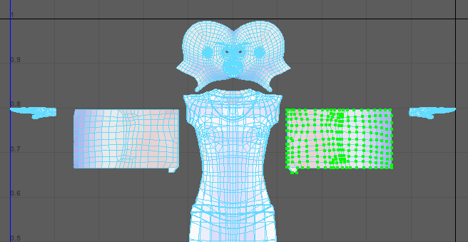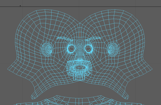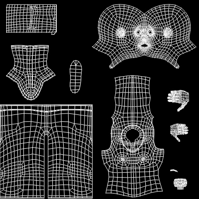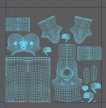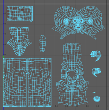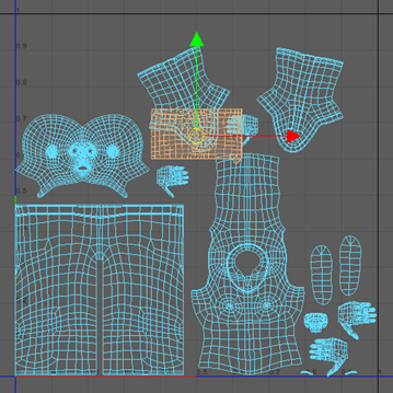 注: 在此图中,头部 UV 壳已放大。增加 UV 壳的比例后,在添加纹理时该部位可以有更多细节。