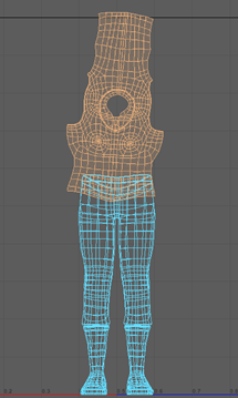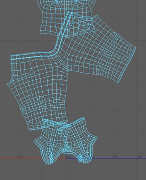 - 使用“对齐工具”(Align Tool)和“固定工具”(Pin Tool),就像对手臂所做的操作一样,直到裤子匹配为止,如下图所示(请记住对齐裤子的内侧边)。对 UV 壳使用“优化工具”(Optimize Tool)。