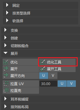 - 切换回“UV 壳选择”(UV Shell Selection),然后按“展开”(Unfold)。