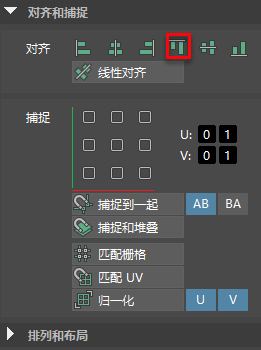 - 切换到“UV 选择”(UV selection),按住 Shift 键并选择手臂上的顶部 UV,然后在“对齐和捕捉”(Align and Snap)下,选择“顶部对齐”(Align to Top)。