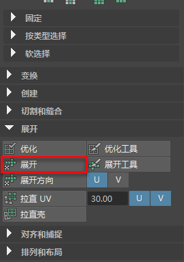 - 在“UV 工具包”(UV Toolkit)的“展开”(Unfold)部分下,按“展开”(Unfold)。