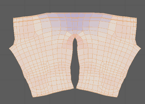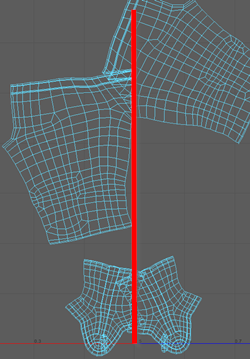 - 切换到“边选择”(Edge Selection),然后选择裤子 UV 壳上从中间垂直穿过的边。使用“旋转工具”(Rotate Tool)使其变直,然后将其移至裤子 UV 壳的中间。