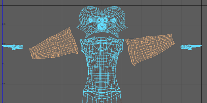脸部模型现在以易于向其添加纹理的方式展开。将头部形状以及其余眉毛和嘴移走,为处理手臂腾出空间。