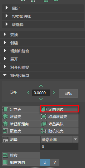 - 切换到“边选择”(Edge Selection)并沿头部 UV 壳中心选择一条边,然后在“排列和布局”(Arrange and Layout)下按“定向到边”(Orient to Edges)。