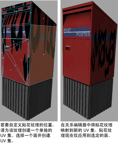 可以在硬件渲染器中显示分层纹理并为每个不同的纹理创建多个 UV 集。这样可以根据需要在场景中定位纹理。
