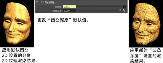 控制显示在曲面上的凹凸的高度。增加“凹凸深度”(Bump Depth)会使曲面更加不平。减小“凹凸深度”(Bump Depth)会使曲面更加平滑。
