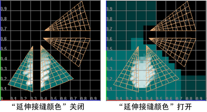 该选项可确保在进行渲染时,UV 壳边界处的纹理属性之间能够平滑过渡。如果启用该选项,Maya 会穿过壳将您绘制的颜色延伸到背景中,并在边界处将绘制颜色和背景色平均化。默认情况下,此选项处于禁用状态。