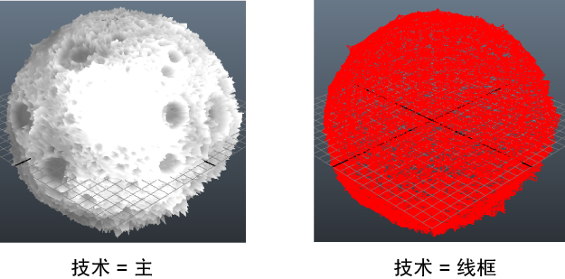 在此着色器中,定义了以下两种技术:主技术(它显示着色的视图)和线框技术(它显示说明细分的线框)。若要设置细分的内部级别和外部级别,可以在 Viewport 2.0 中调整“内部级别/100*100 像素”(Inner levels/100*100 pix)(100 x 100 像素区域中的内部级别数)和“外部级别/30 像素”(Outer levels/30 pix)(每 30 像素分段的级别数)设置并查看效果。