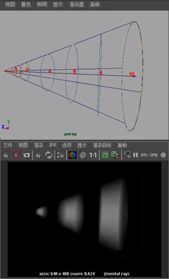 - 应用“灯光雾”(Light Fog)(在聚光灯的“属性编辑器”(Attribute Editor)的“灯光效果”(Light Effects)区域中,单击“灯光雾”(Light Fog)旁边的框)以查看结果。
