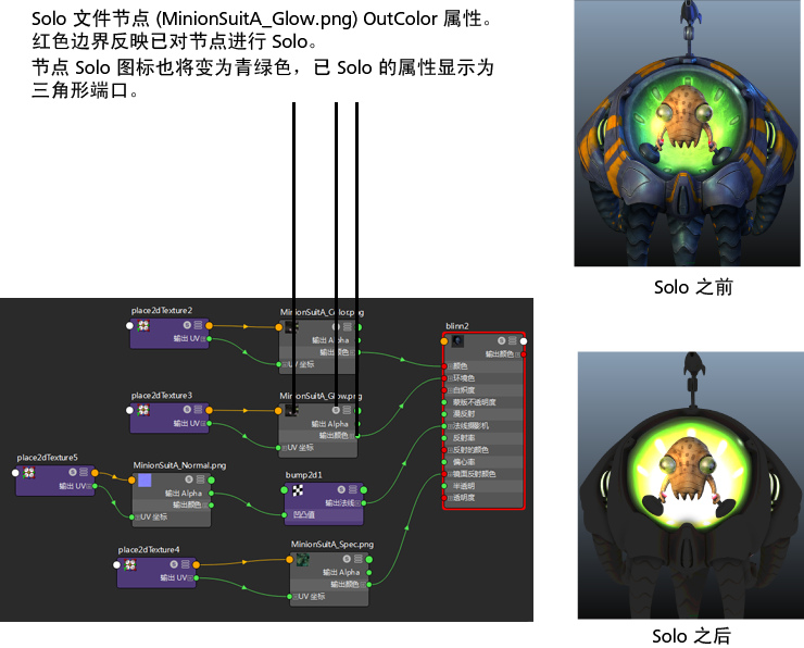 若要改进此工作流,请使用此功能来单放着色节点。单放 允许您预览特定节点输出属性的效果;即,图表上游部分的结果,作为该节点的输出属性的先导。通过单放节点,可查看其贡献,而无须修改您的着色图表,因此在复杂的着色网络中工作时可以轻松地识别问题。