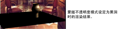 选择“黑洞”(Black Hole)模式时,材质的蒙版通道将设定为 0(完全透明)。这将在 Alpha 输出中创建黑洞,其中对象指定的着色器会将渲染蒙版“挖空”。