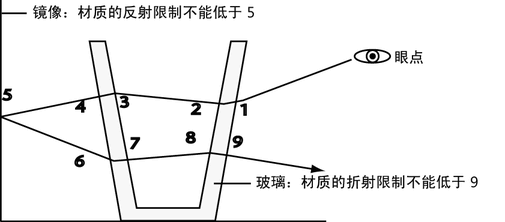 “整体内部反射”(Total Internal Reflection) (TIR) 这一物理属性可使某些透明对象不折射灯光。这是因对象厚度内反射的光线引起的。如果出现这种情况,则增加“折射限制”(Refraction Limit)无效果,其原因在于“反射限制”(Reflection Limit)在光线穿透曲面之前便已将其停止。但是,由于 TIR 是一种实际属性,因此可能需要保留这种效果。
