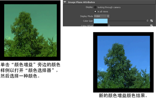 应用于图像平面中所有颜色的比例因子。Maya 按“颜色增益”(Color Gain)颜色倍增图像平面中的所有颜色。例如,您可以通过将“颜色增益”(Color Gain)颜色设置为蓝色来对看上去太绿的图像平面进行颜色校正。默认颜色为白色(无效果)。