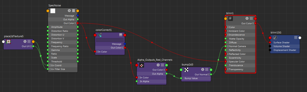 “单一噪波”(Simplex Noise)节点连接到“颜色修正”(Color Correct)节点。“颜色修正”(Color Correct)的输出是“通道”(Channels)节点,它会将红色通道作为 Alpha(“通道”(Channels)设置为“R”)输出。此 Alpha 输出值用作“Blinn”着色器的凹凸贴图。