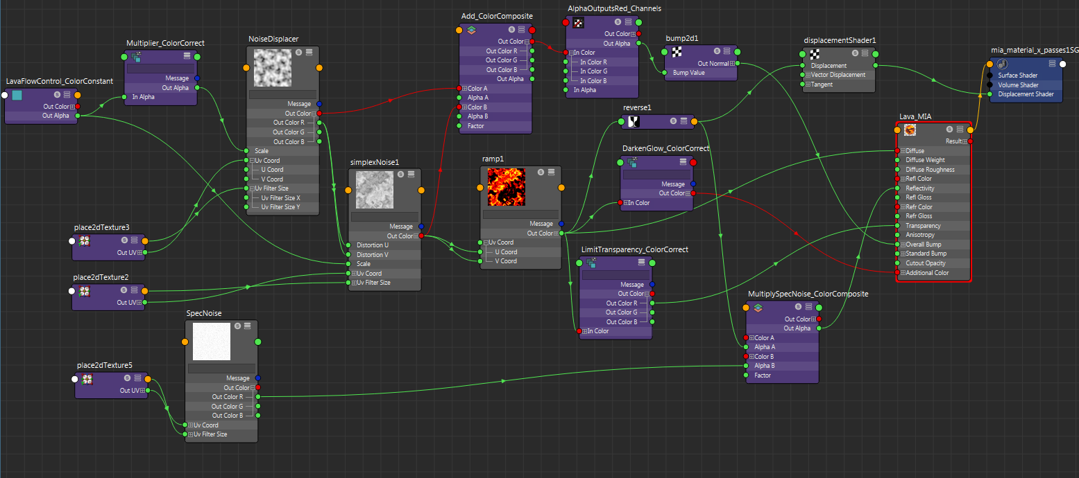 若要添加逼真的熔岩,则应反射其黑色区域,因为它是冷熔岩岩石。与创建位移类似,在这种情况下再次使用“渐变”(Ramp)反转输出。若要为高光添加其他关注区域,则应使用“颜色合成”(Color Composite)节点将它乘以另一个“单一噪波”(Simplex Noise)。反光对象(如金属)的镜面反射度具有密集噪波图案,且“单一噪波”(Simplex Noise)允许您通过调整“缩放”(Scale)属性创建该图案,而不是使用平铺瑕疵。“颜色合成”(Color Composite)节点的 Alpha 输出是 mia_material_x_passes 着色器的“反射率”(Reflectivity)属性的输入。