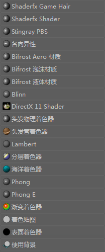 从 Hypershade “创建”(Create)选项卡 和“创建渲染节点”(Create Render Node)窗口中,可以创建“Surface Materials”(表面材质)、“体积材质”(Volumetric Materials)和“置换材质”(Displacement Materials)。有关表面材质的详细信息,请参见 Maya 表面材质。