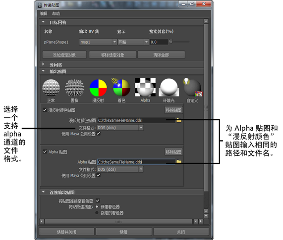 - 选择支持 Alpha 通道的文件格式(例如,.dds、.exr、.tif)。