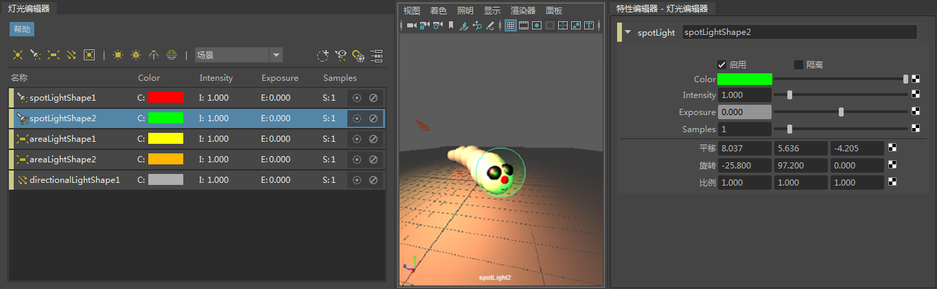 此窗口可以停靠到 Maya UI 中,或者停靠到灯光编辑器工作区中,使其位于灯光属性的上方或下方、左侧或右侧。