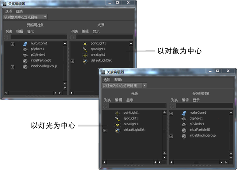 选择灯光链接选项将在“以灯光为中心”(Light-Centric)或“以对象为中心”(Object-Centric)模式下打开“关系编辑器”(Relationship Editor)。