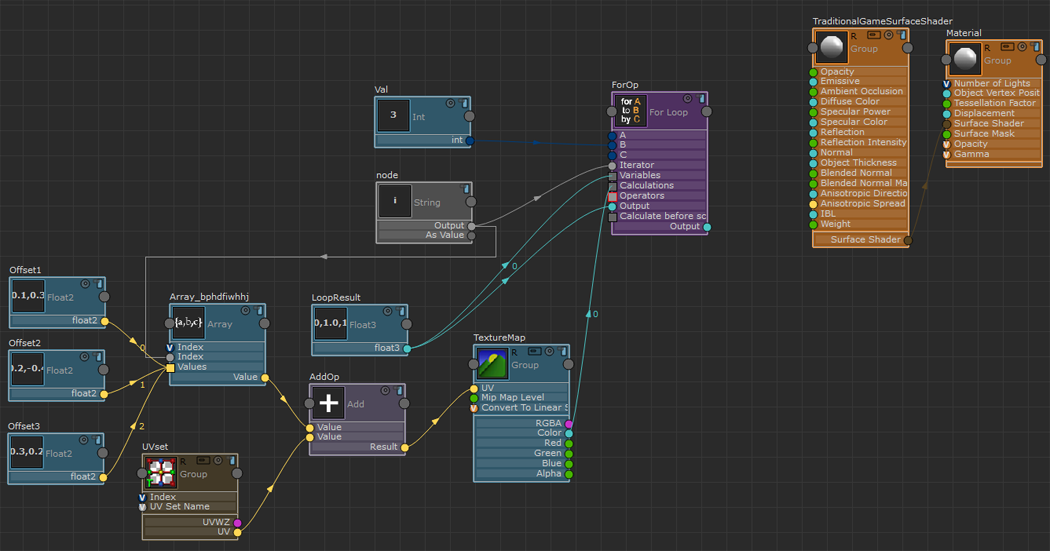 以下示例说明如何使用 for 循环通过不同的 UV 偏移采样纹理三次。将采样值相加,然后除以三,所得平均值应用到“TraditionalGameSurfaceShader”的“漫反射”(Diffuse Color)通道。